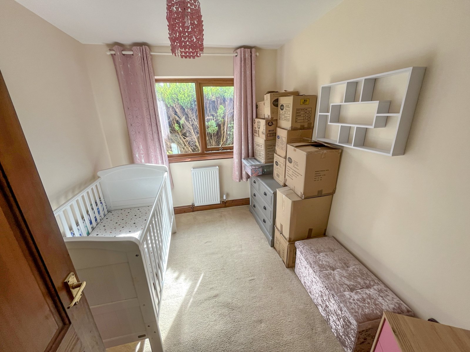 Carpeted flooring, radiator, uPVC double-glazed window, light fitting, radiator.