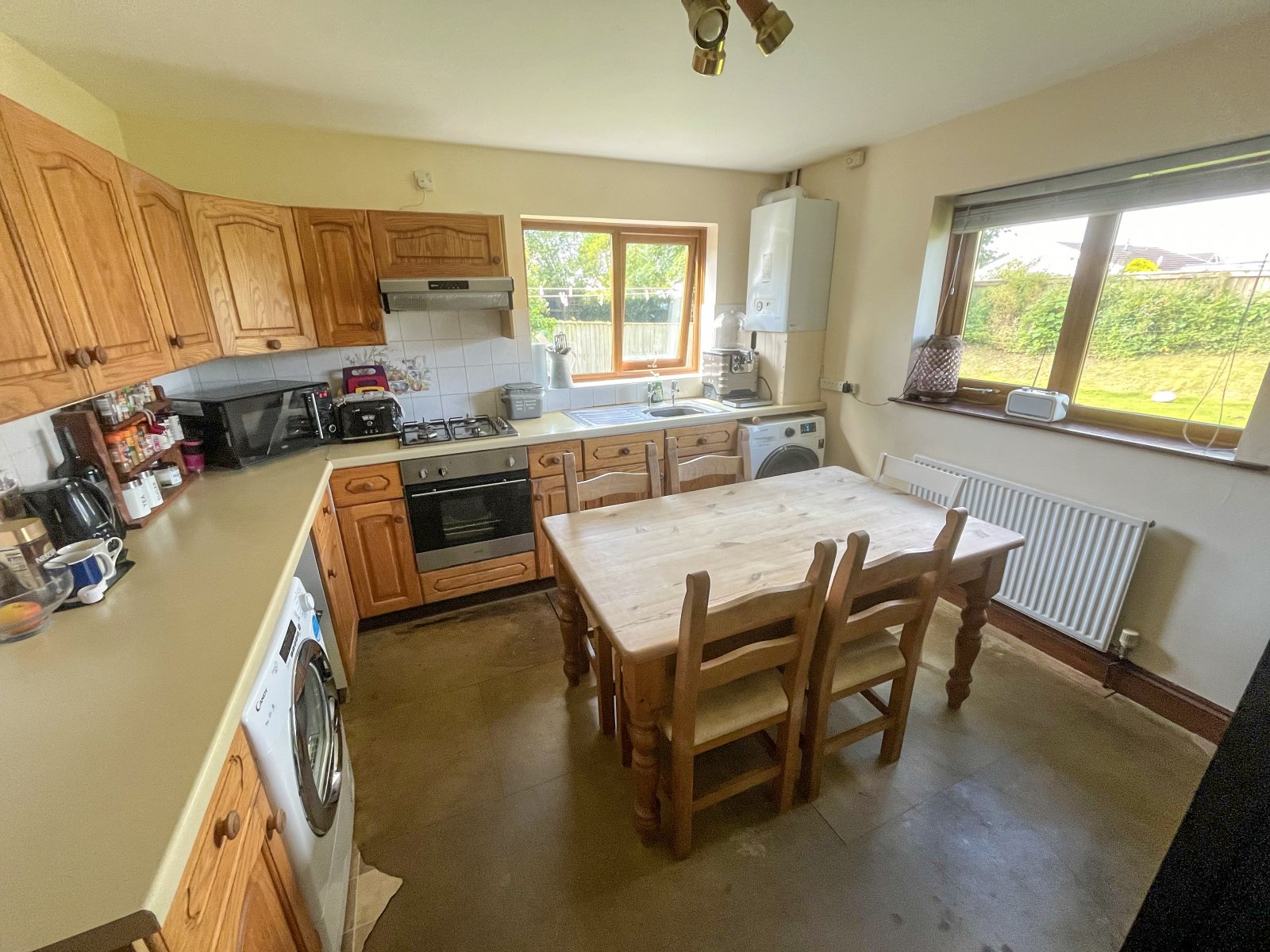 Range of base and wall units, integrated electric fan oven with gas hob and extractor, lighting, space for washing machine and tumble dryer, combi boiler, sink and drainer, 2 x uPVC double-glazed windows, radiator, light fittings.