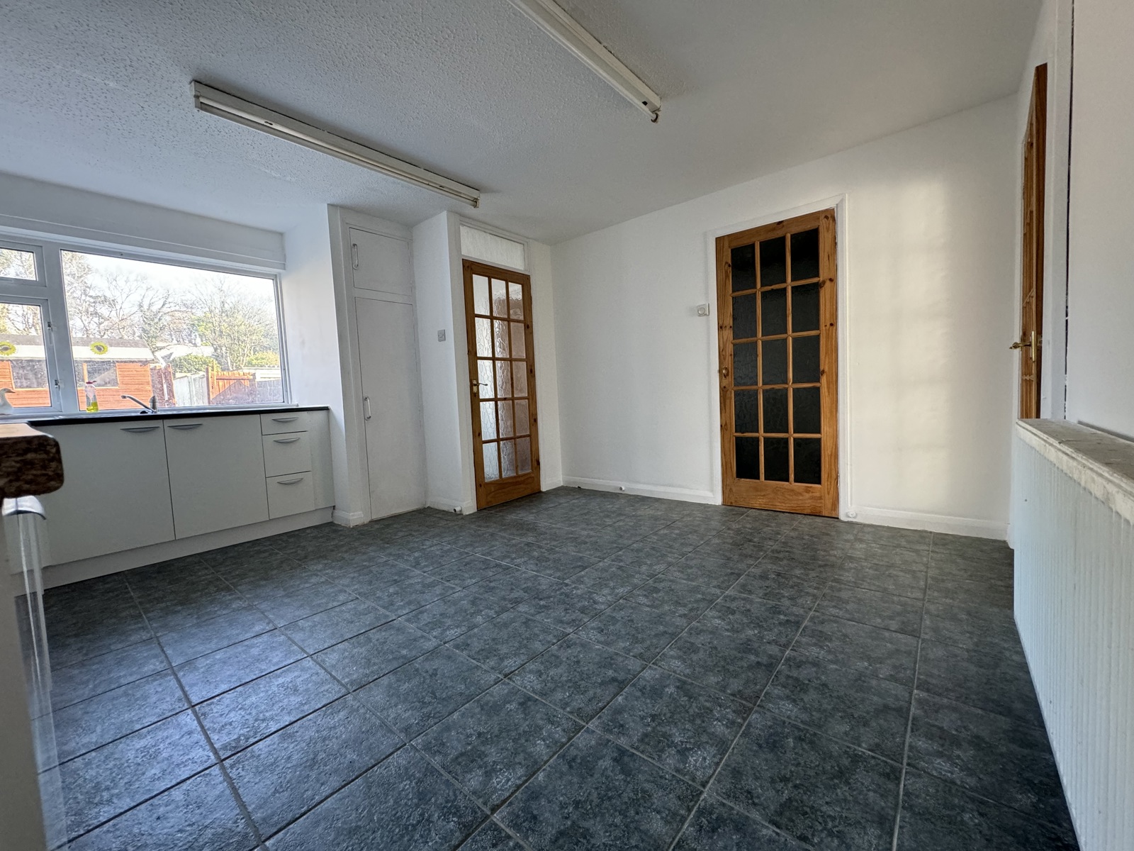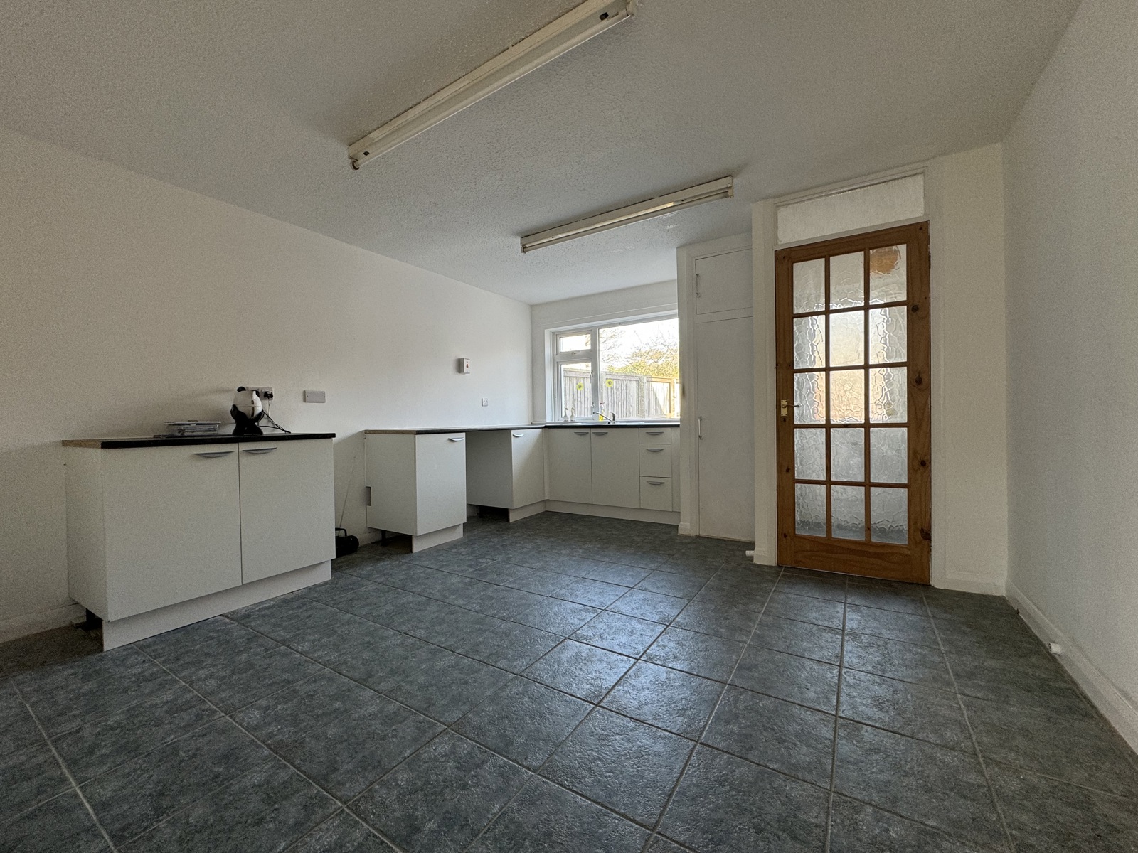 With views looking out into the back garden, and large storage cupboard which contains the boiler