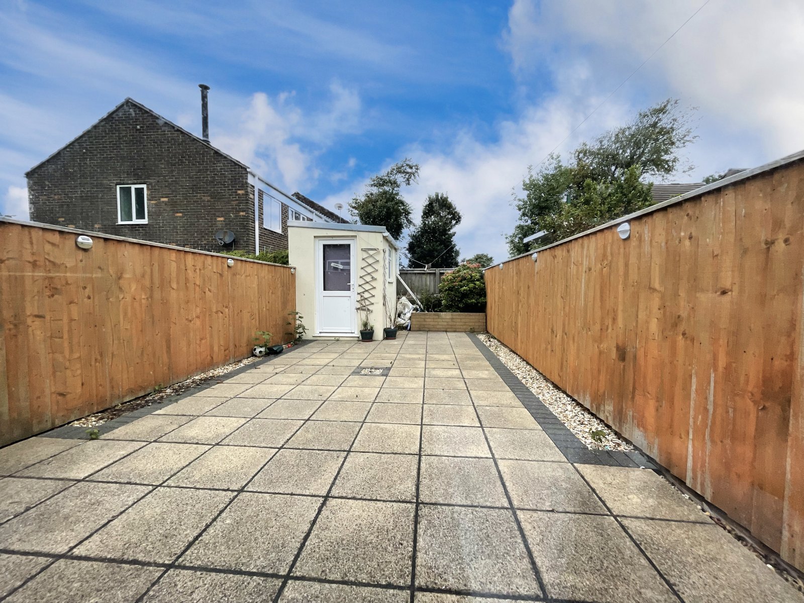 The enclosed rear garden is currently utilised as a patio and offers a small garden shed. To the fore there is a small area mostly laid with decorative stone.