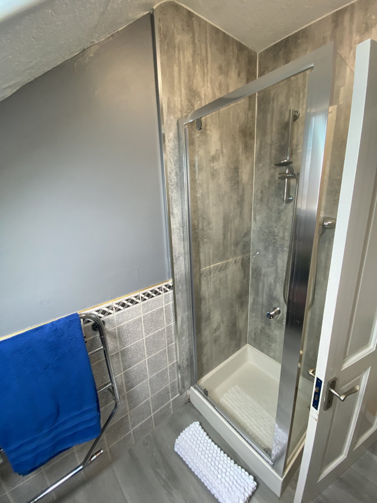 Fitted 2 piece suite with walk in shower cubicle, velux window, heated towel rail, vinyl flooring.