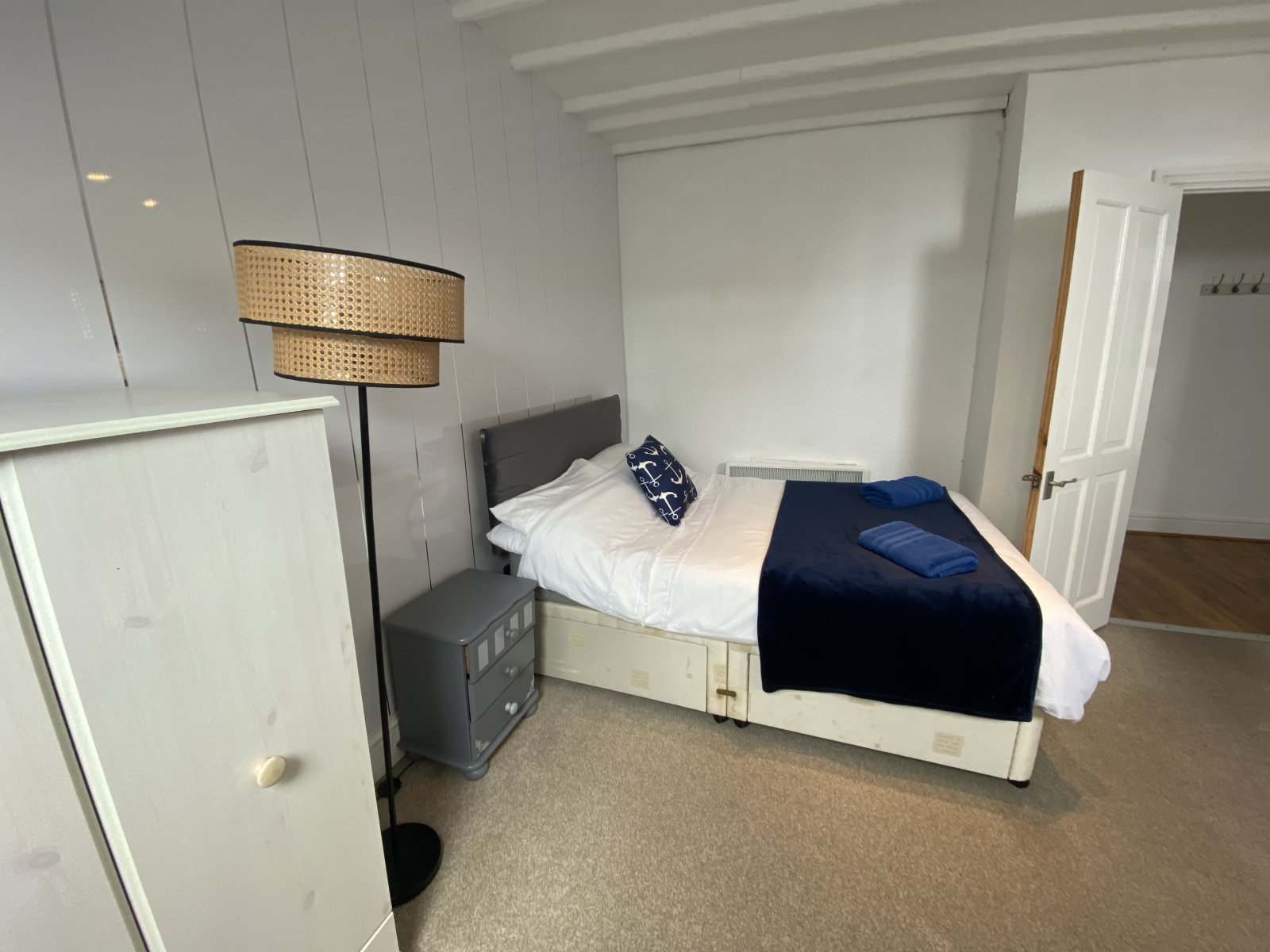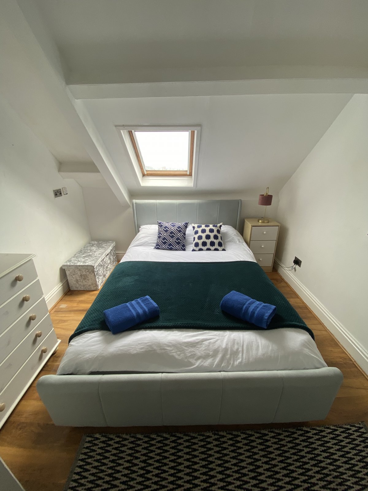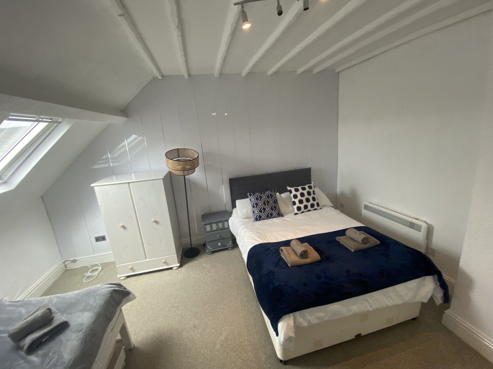 Spacious double bedroom, which can accommodate a double bed and a single bed, Electric panel heater, fitted carpet, velux window.