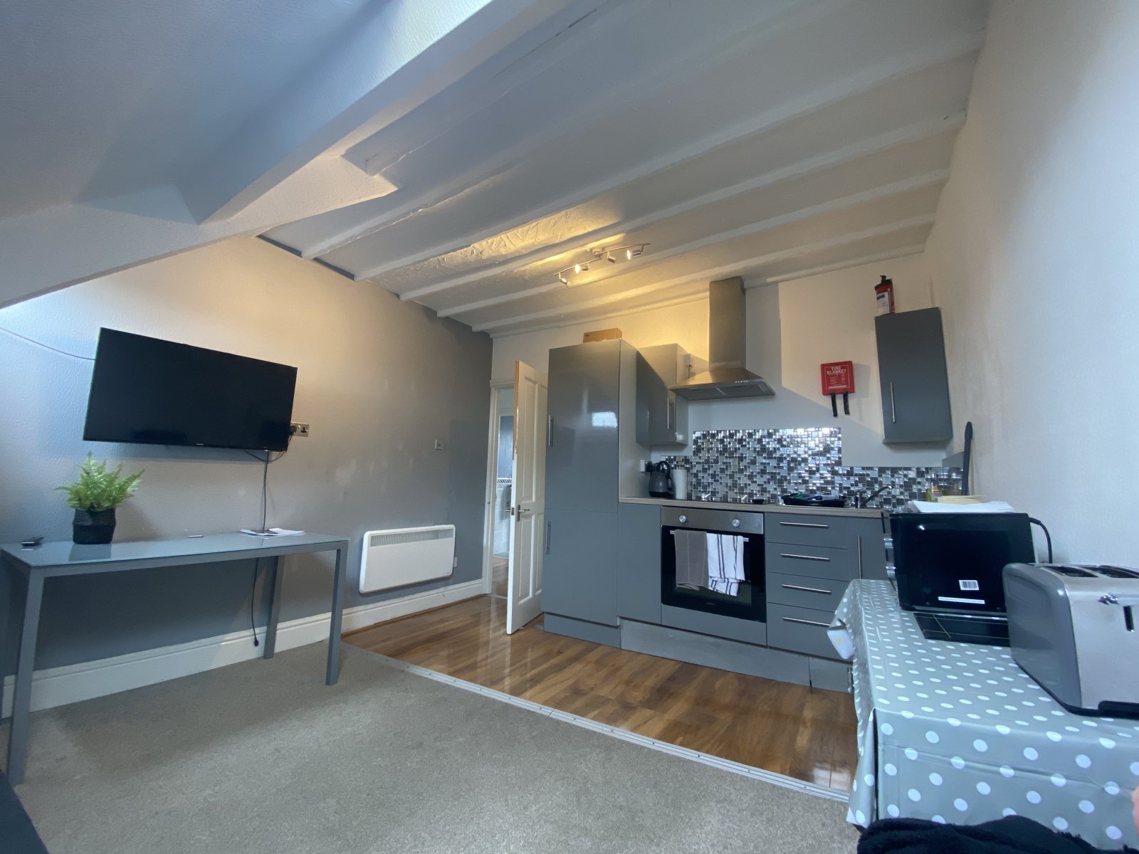 Open plan living room/kitchen. Fitted work top and base unit, electric panel heater, light fitting, stainless steel extractor hood, 2 velux windows. Partial laminate flooring and carpet.