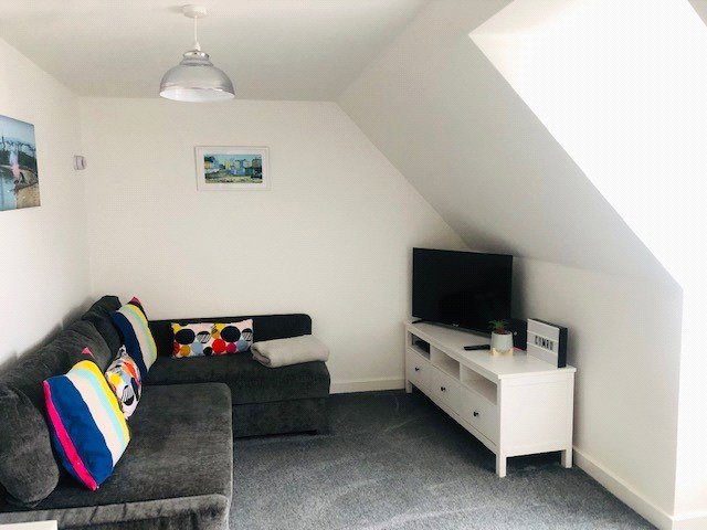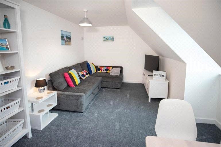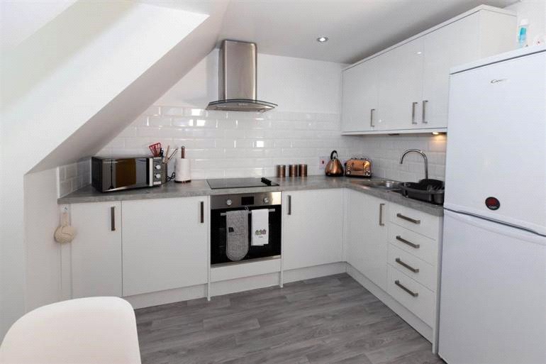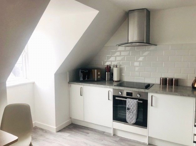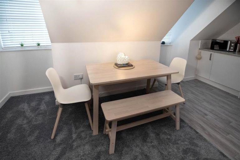 Open plan with two dormer windows to front. Lounge/Dining area- Carpeted, space for sofa and chairs, ceiling lights, smoke detector, wall mounted electric storage heater, space for table and chairs. Kitchen Area - Modern wood effect vinyl floor, range of wall and base units with inset 1.5 stainless steel sink unit and drainer with mixer tap, contrasting worksurface, subway tiling to walls, ceiling lights, electric hob and oven with extractor over, space for fridge.
