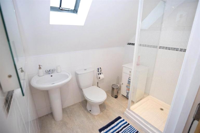 Roof window, fully tiled walls, wash hand basin, wc, glazed shower cubicle with electric wall mounted shower, inset ceiling lights, wall mounted electric heater, vinyl flooring, wall mounted illuminated mirror.