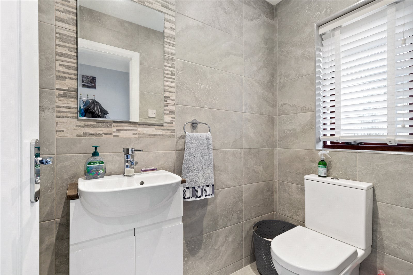 Tiled floor and walls, wall mounted mirror, radiator, wash hand basin with mixer tap on vanity unit, WC, wooden double glazed window with obscure glass with fitted blinds.