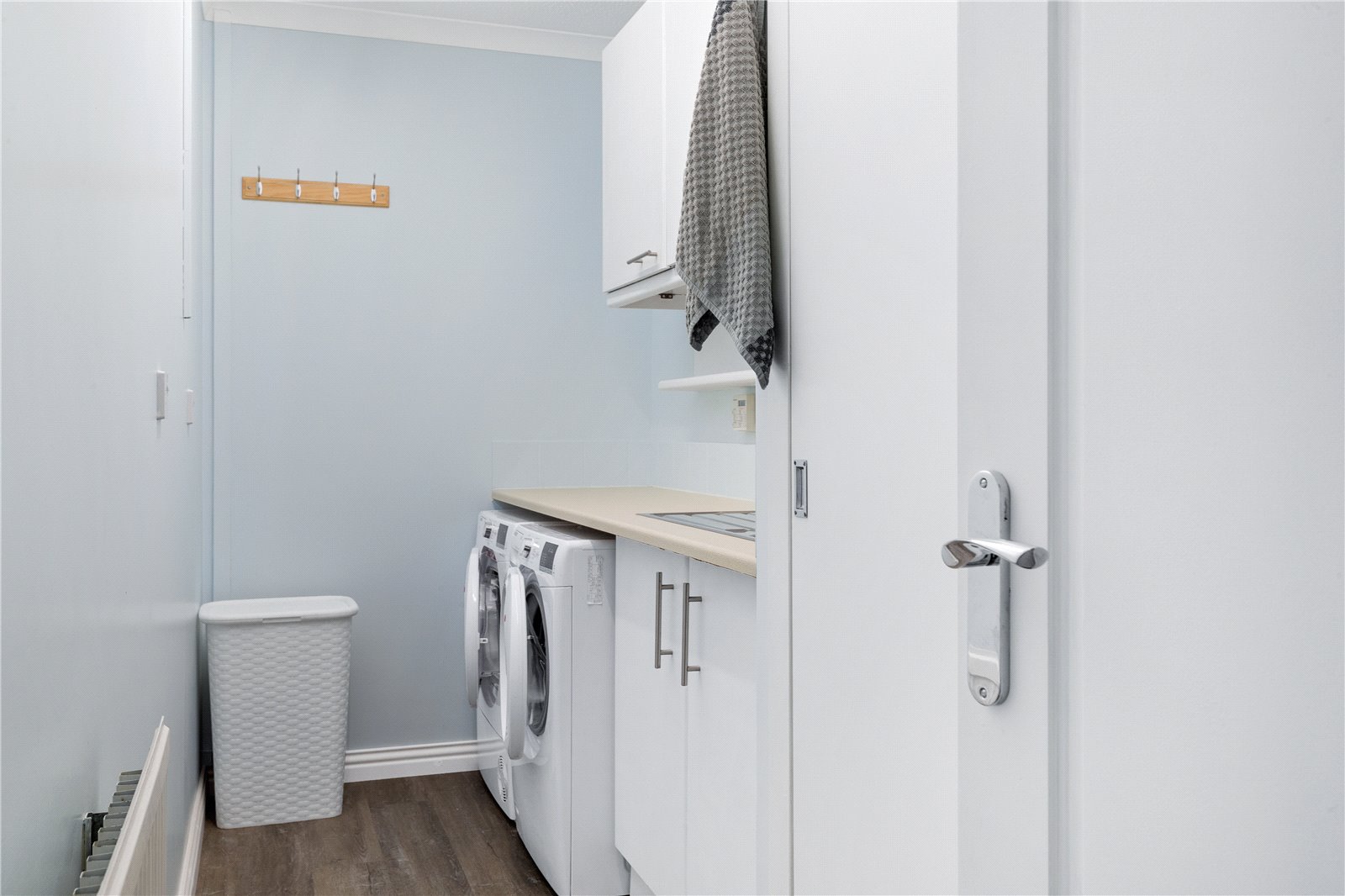 Laminate flooring, sink with drainer and mixer taps, wall mounted cupboards, space for washer and dryer, airing cupboard with water tank.
