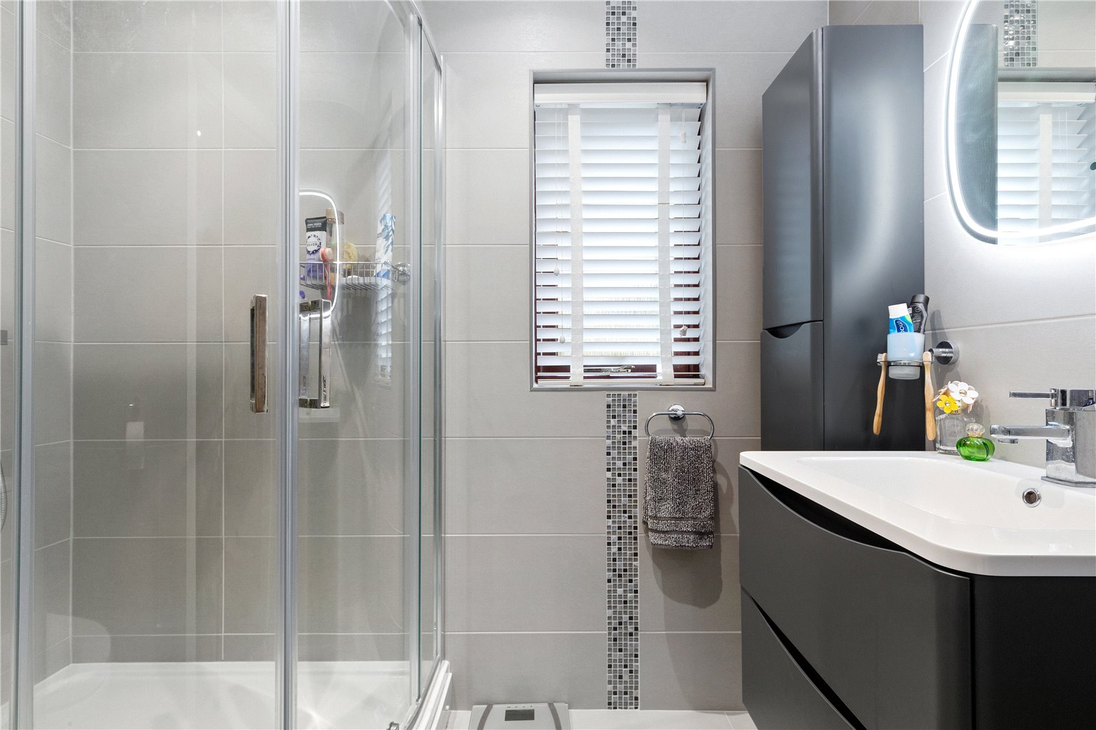 Tiled walls and floor, wash hand basin with mixer taps in vanity unit, heated towel rail, wall mounted bathroom storage, shower with glass sliding doors, WC, spot lights on ceiling.