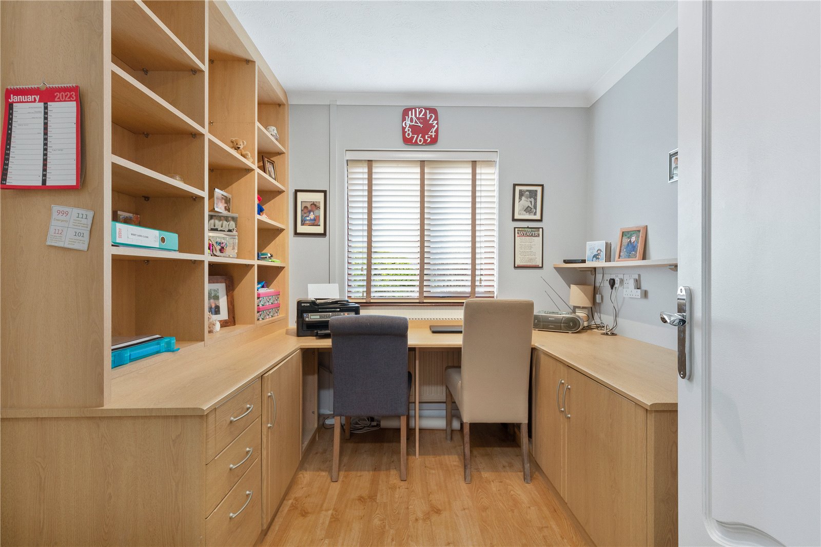 Laminate flooring, fitted office suite complete with shelving, cupboards and desk space, storage cupboard, radiator, ceiling light, wooden double glazed window with fitted blinds.