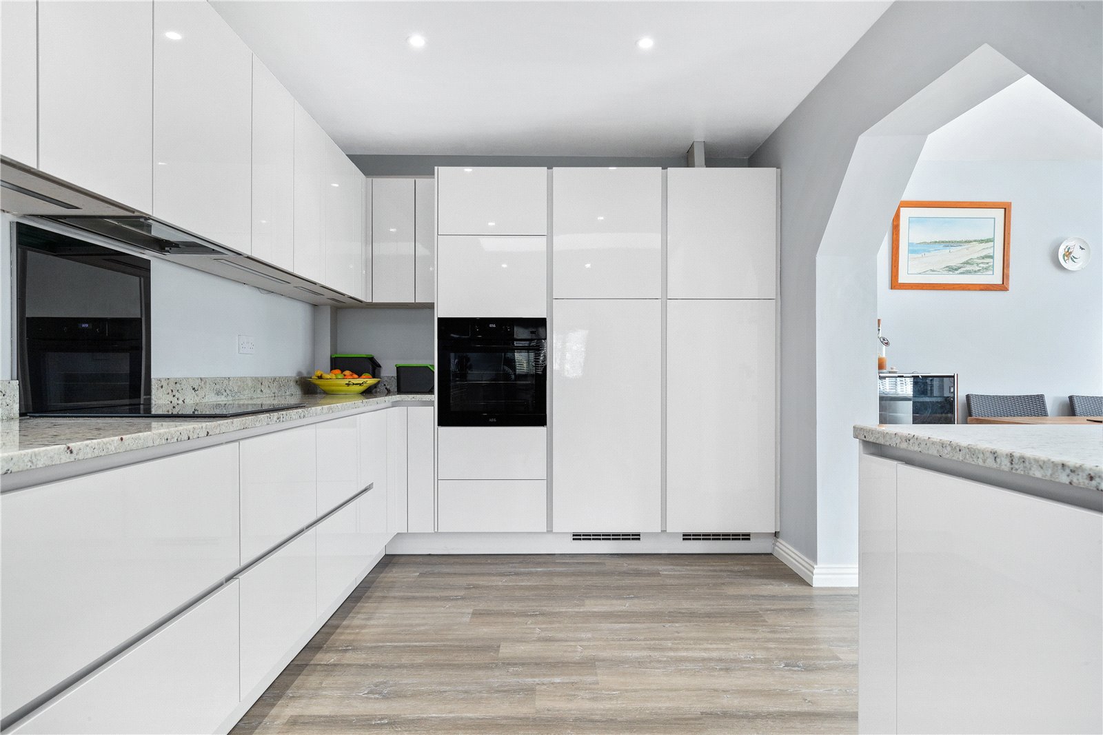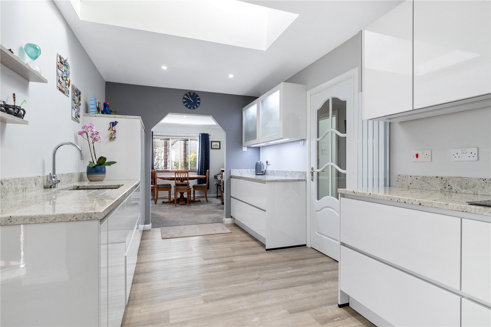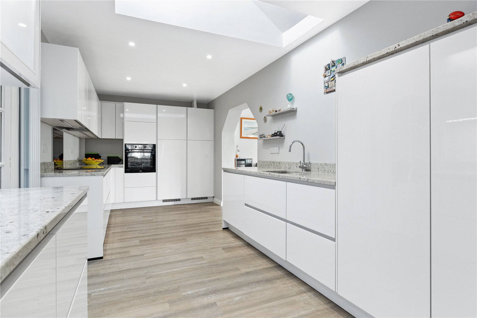 Laminate flooring, range of base and wall units which include an integrated fridge, freezer, oven and dishwasher. Induction hob with over head, pull out extractor fan. Tall radiator, skylight, spot lights in ceiling, archways to conservatory area and: