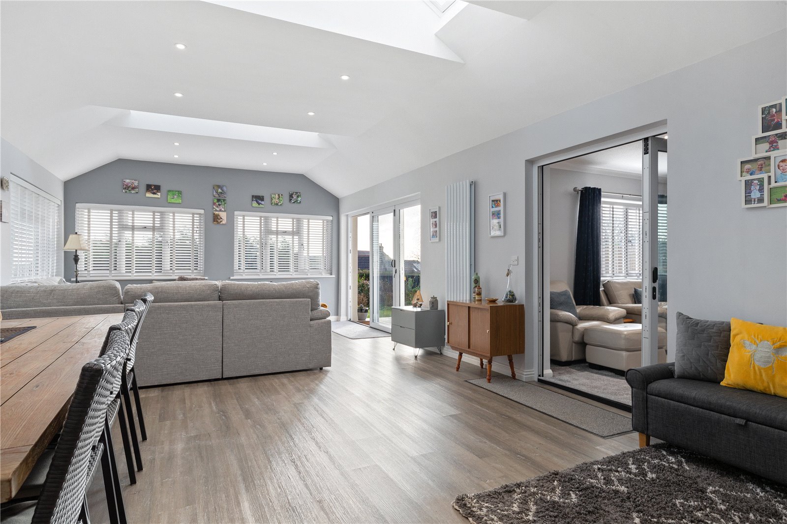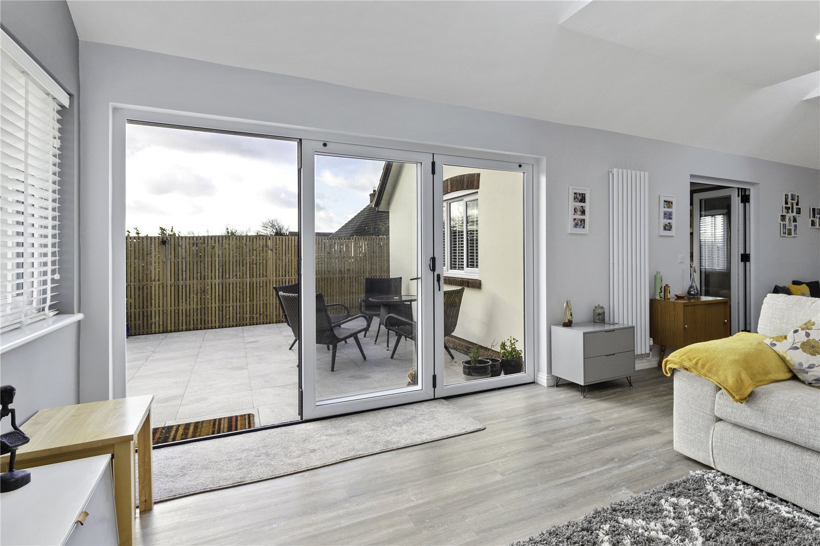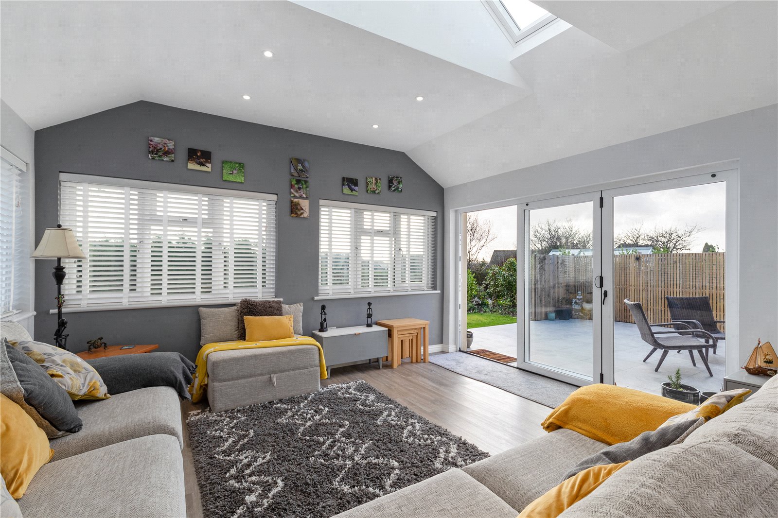 Laminate flooring continuing from the kitchen, skylight windows, ceiling spot lights, 2 tall radiators, bi-fold doors onto patio and garden, large uPVC double glazed windows all with fitted blinds.