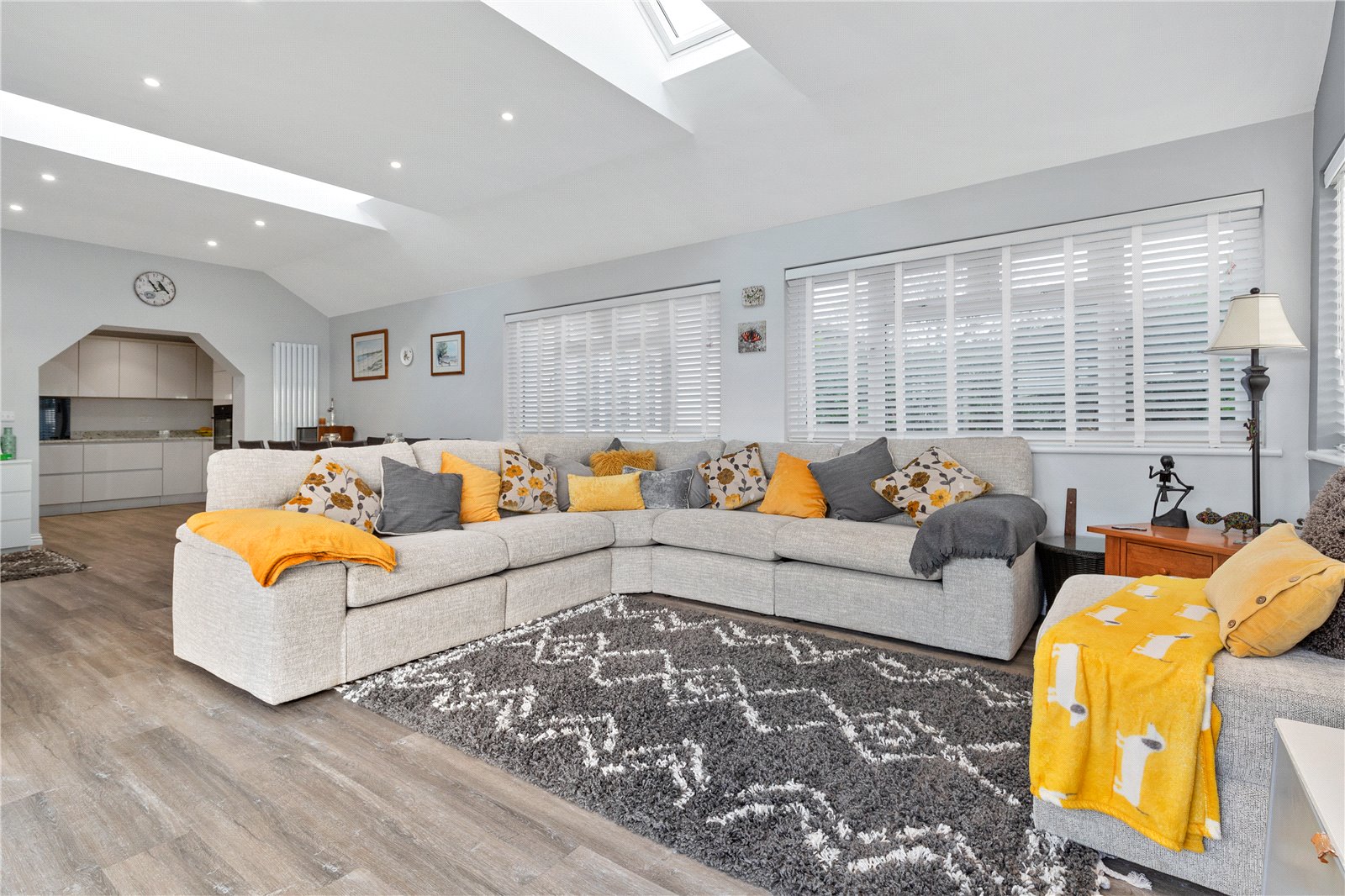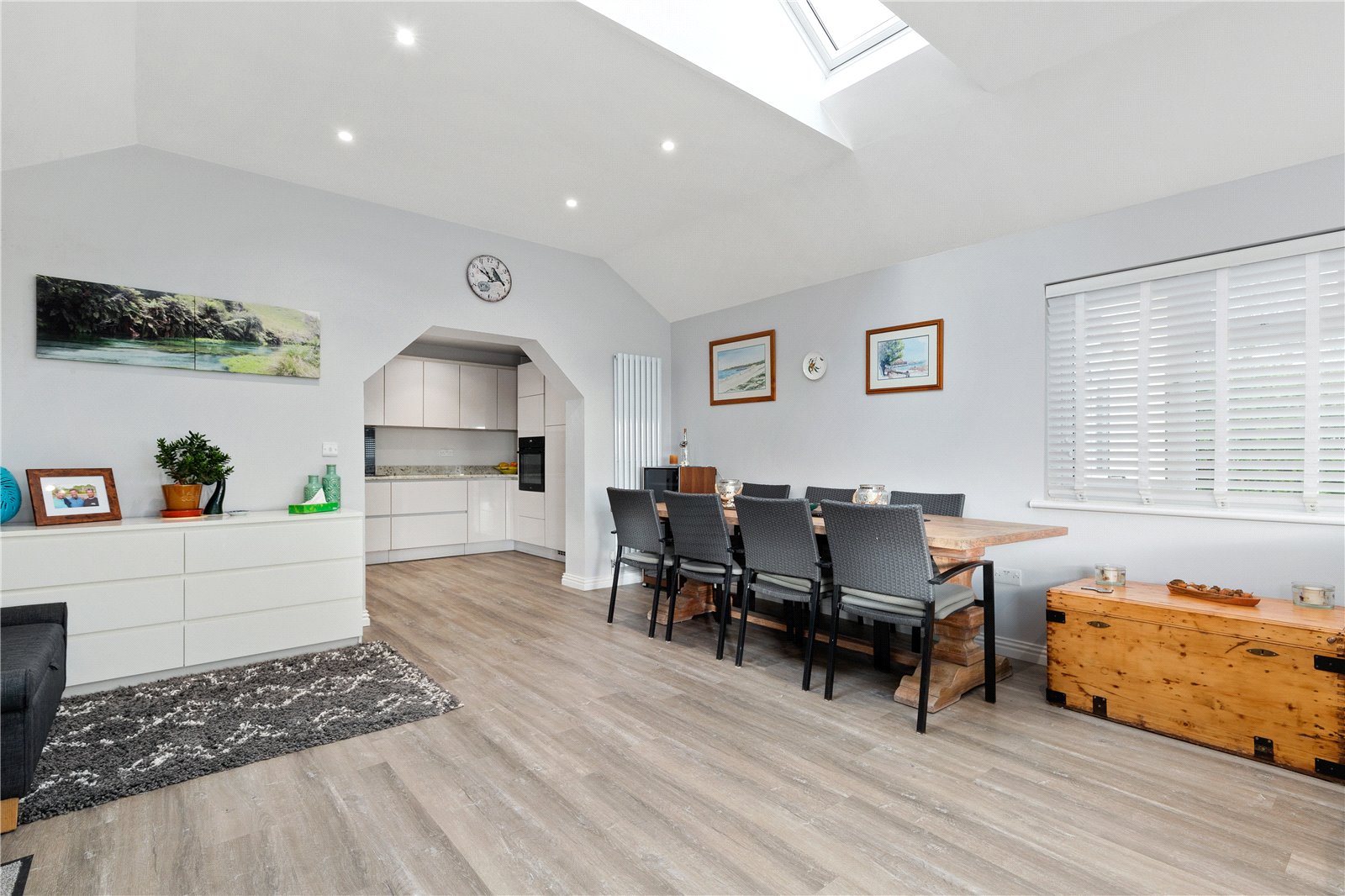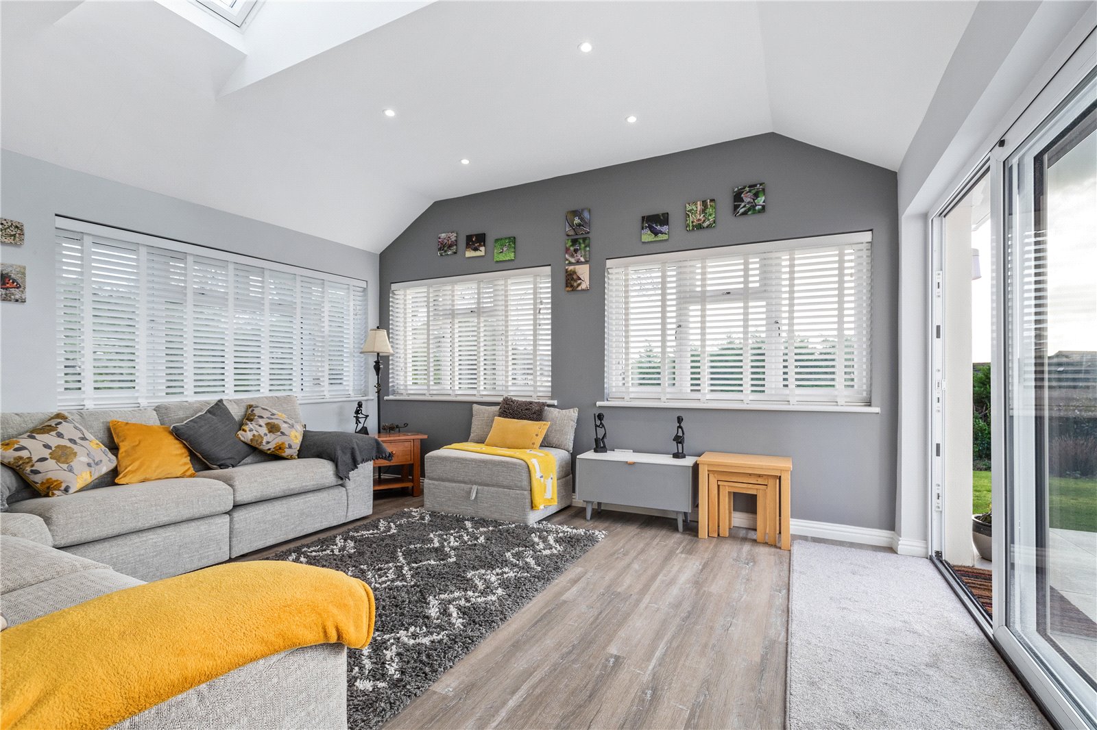 Laminate flooring continuing from the kitchen, skylight windows, ceiling spot lights, 2 tall radiators, bi-fold doors onto patio and garden, large uPVC double glazed windows all with fitted blinds.