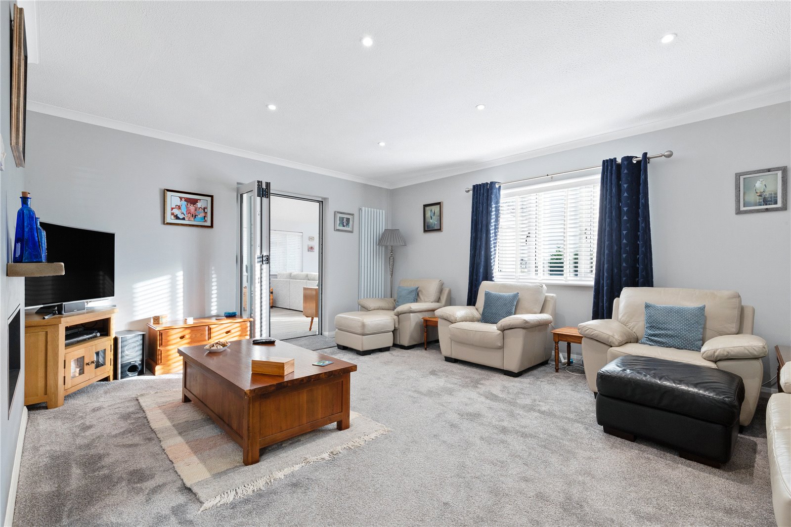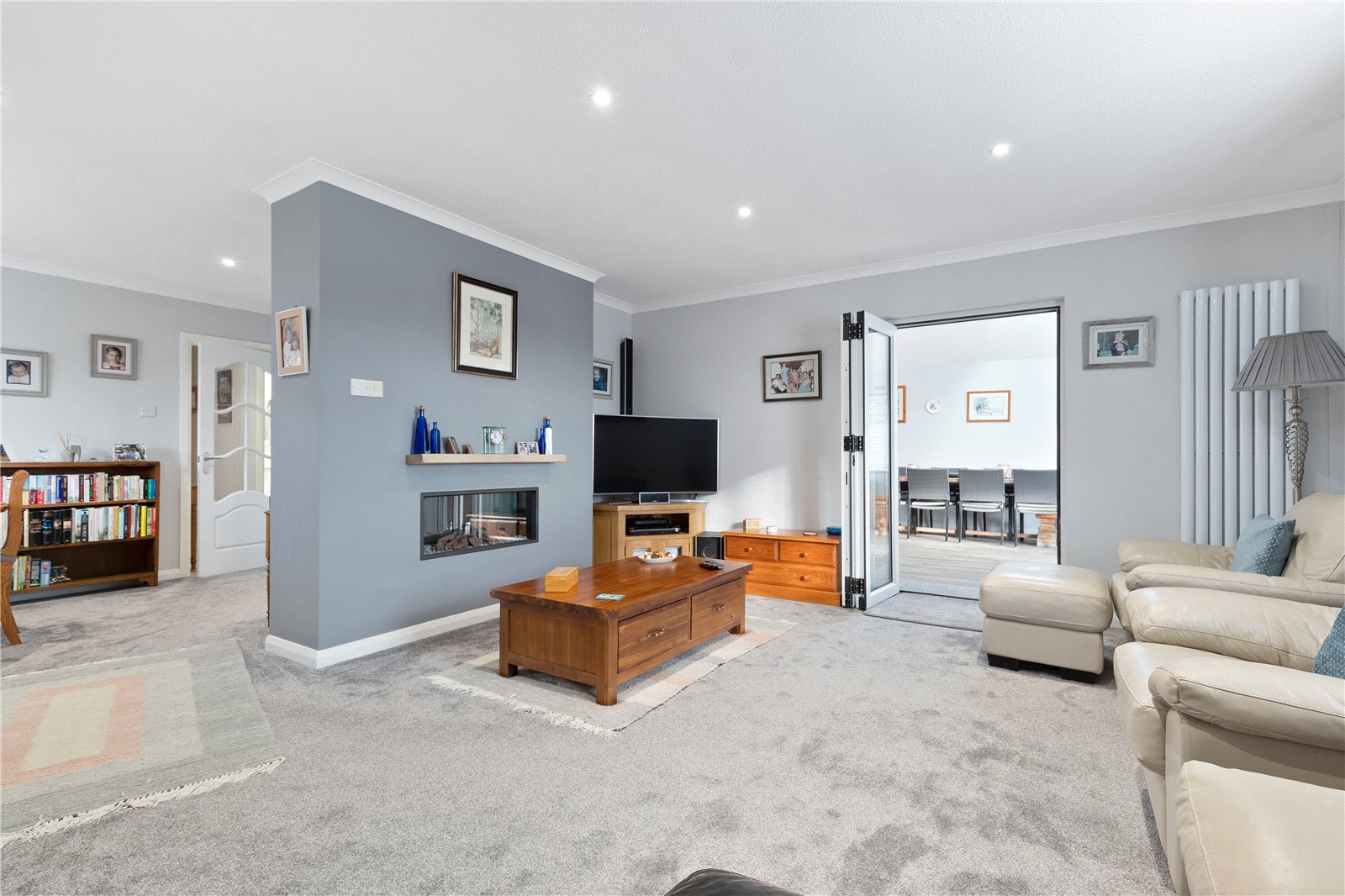 Carpeted floor continues, as do the ceiling spot lights, feature electric fire flush to chimney breast, uPVC double glazed window with fitted blinds, radiator, Bi-fold doors leading to: