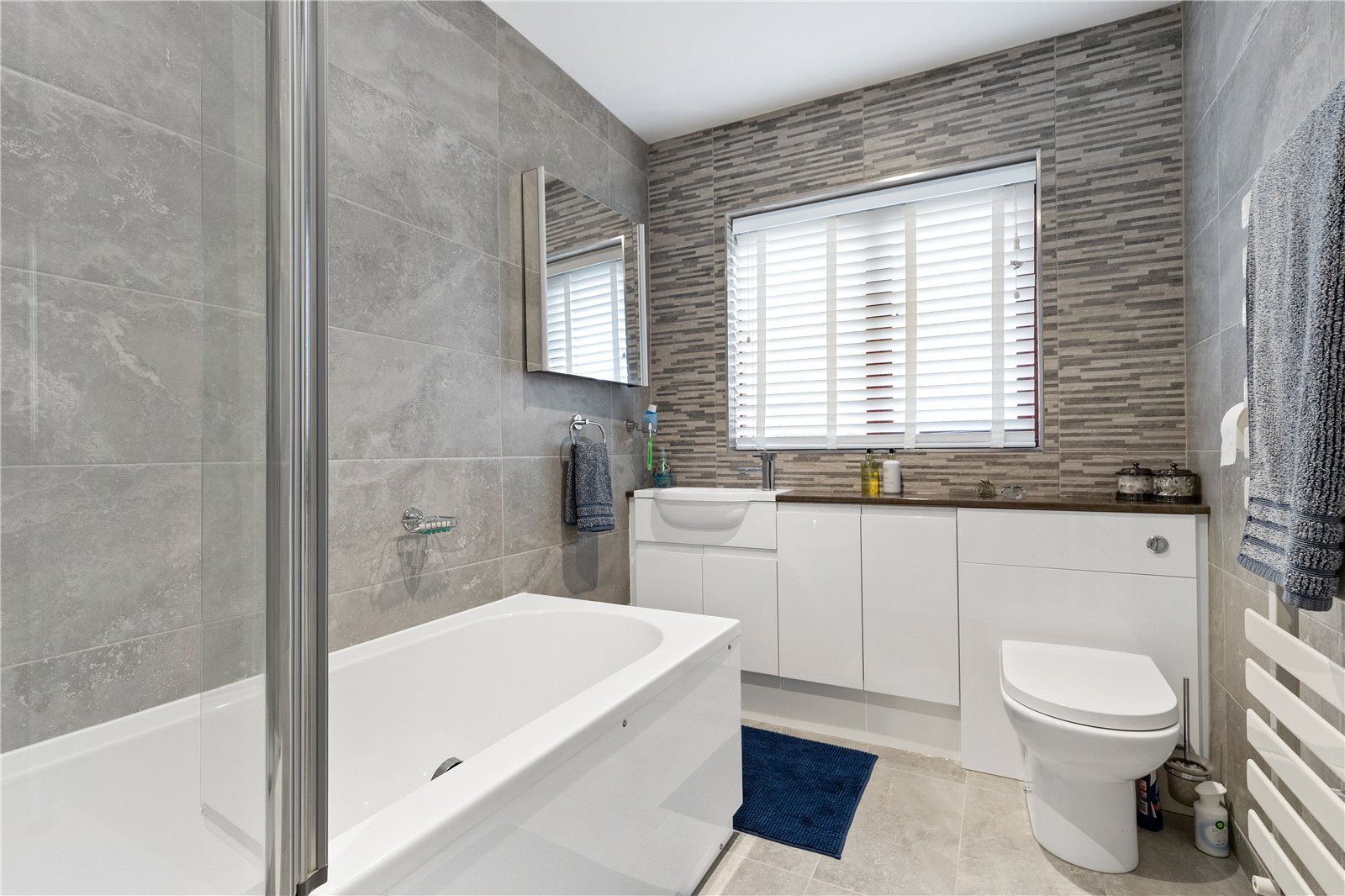 Tiled floor and walls, fitted bath with electric shower over and corrugated glass screen, wash hand basin with mixer taps in vanity unit, WC, wooden double glazed window with obscure glass, spot lights on ceiling.