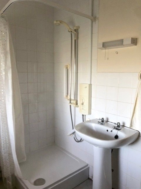 uPVC double glazed obscure window to rear, panelled bath with tiled splashback, wc, wash hand basin with tiled splashback, newly installed shower tray with Mira shower over and shower curtain, radiator, vinyl flooring, extractor/wall heater.