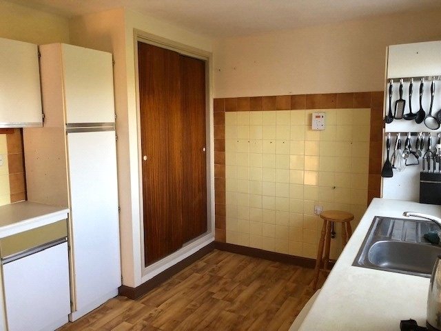 uPVC double glazed window to rear, uPVC double glazed door to conservatory, range of wall and base units with stainless steel sink unit and drainer with mixer tap, space for fridge, plumbing for washing machine, cooker point. built-in shelved cupboard, vinyl flooring, tiling to walls, radiator.