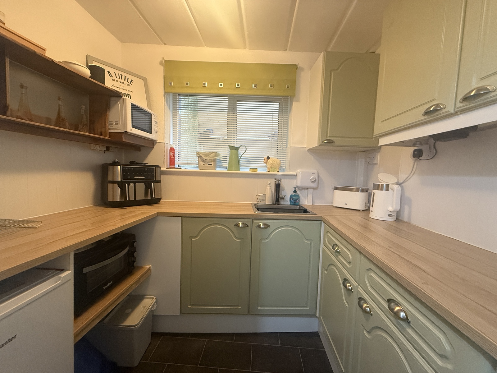 Tiled flooring , double glazed window, fitted eye level & base units, stainless steel mono block sink unit.