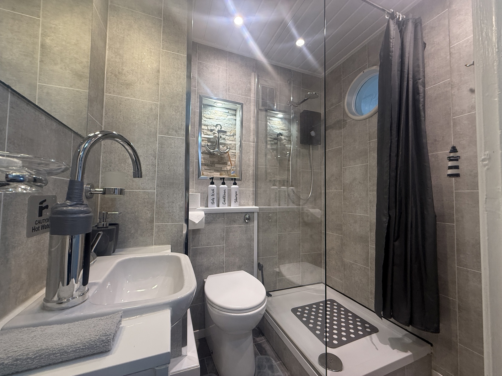 Modern fitted shower room with WC, WHB,Shower,tile flooring.